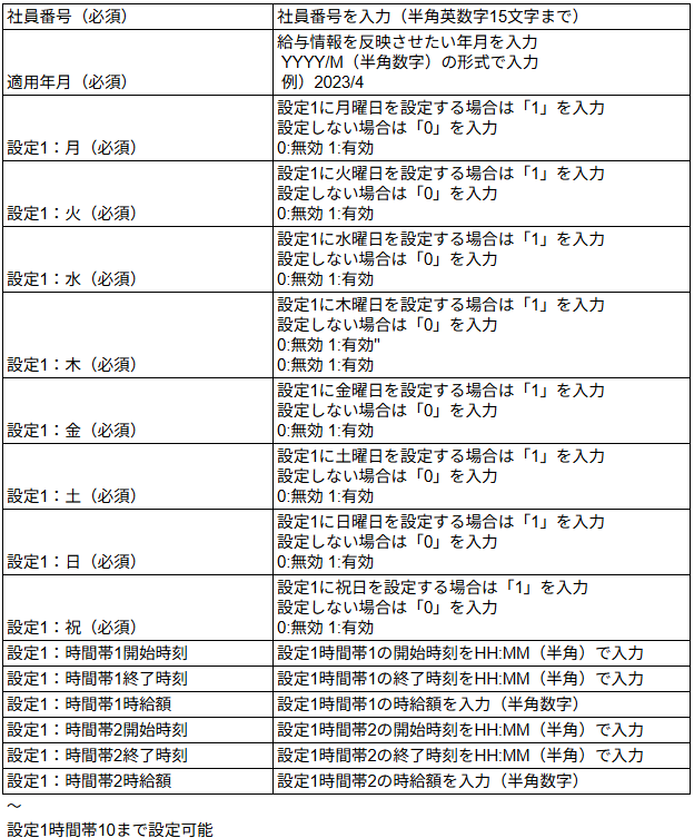 設定1~3の時間帯1~10まで設定が可能です。設定をしない時間帯、時給の列もインポートには必要となりますので列は削除せずにデータを作成してください。