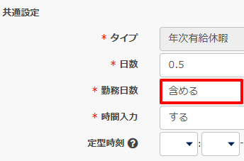 7.勤務日数 | タイプを「年次有給休暇」を選択している場合のみ、勤務日数に含むかどうかを選択できます。タイプ「年次有給休暇」以外を選択した場合は変更することはできません。 ※勤務日数を「含める」、かつ時間を入力している場合に集計項目の勤務日数に集計されます。 |