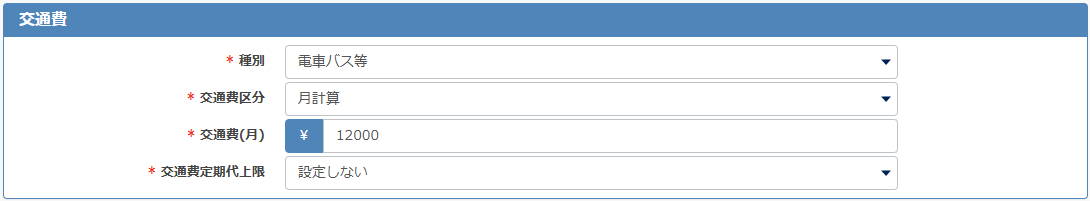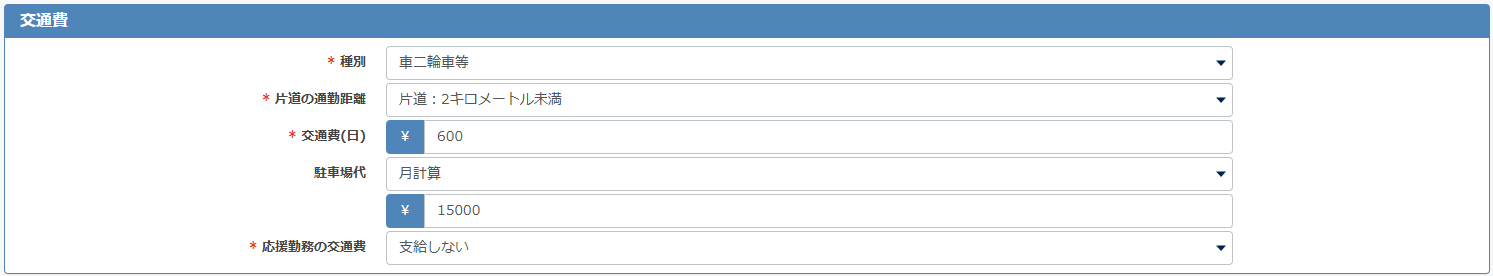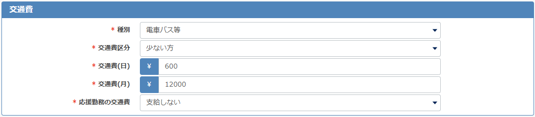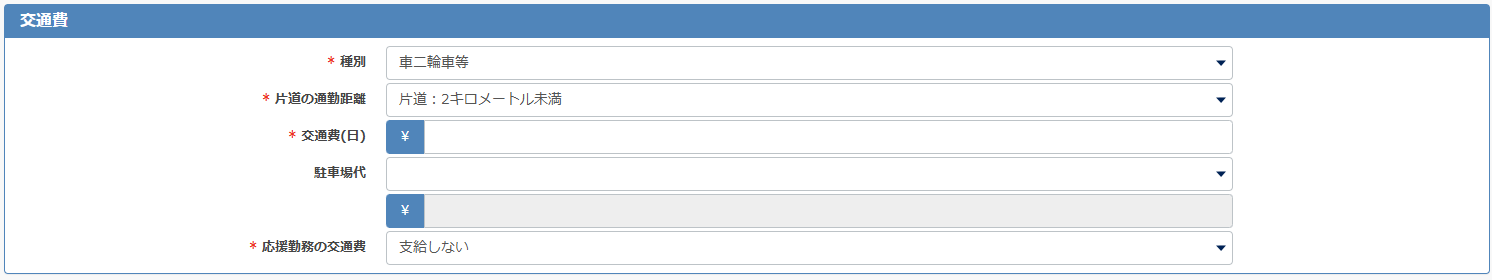 交通費の支給方法は、[交通費なし・電車バス等・車二輪等]から選択してください。