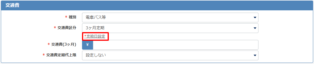 下記は3ヶ月定期で支給日を8月を選択した例です。8月、11月と3ヶ月ごとに交通費が支給されます。