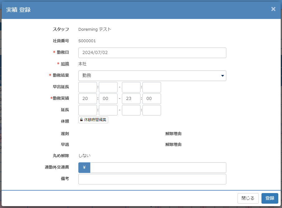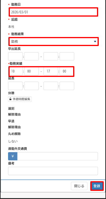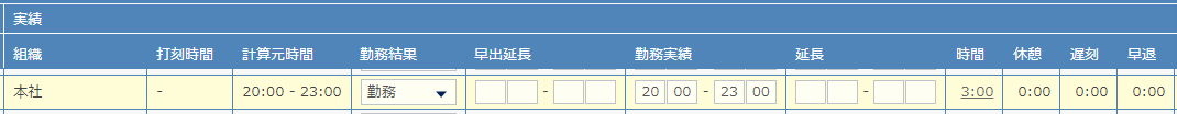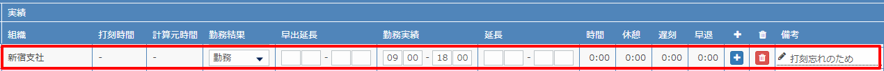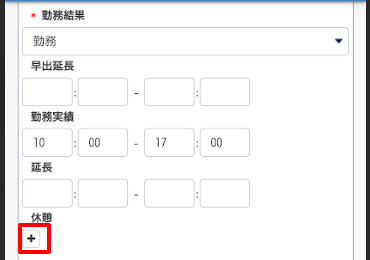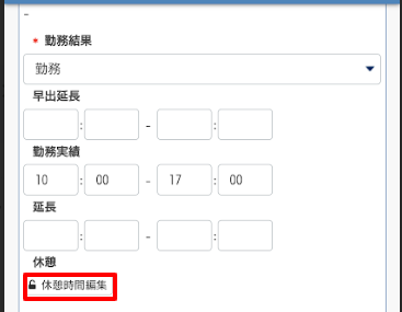 (※早出・延長時刻の編集権限が与えられている場合は編集が可能です) - 勤務実績:勤務開始と終了時刻を入力します。必須項目です。