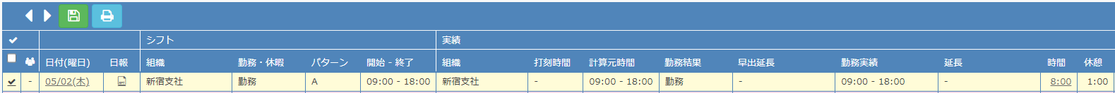- 1日複数実績の日は2行で表示されます。