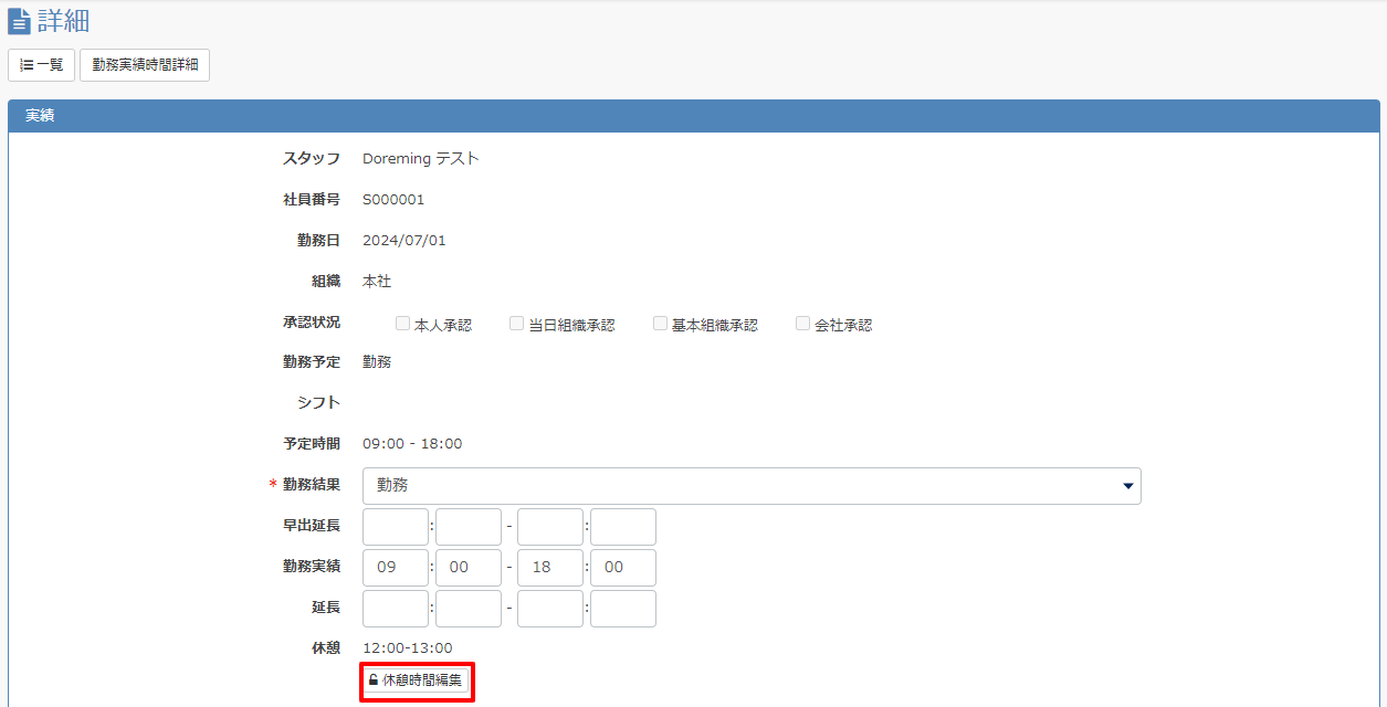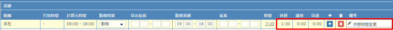 休憩時間などの変更(勤務実績詳細画面からの修正)