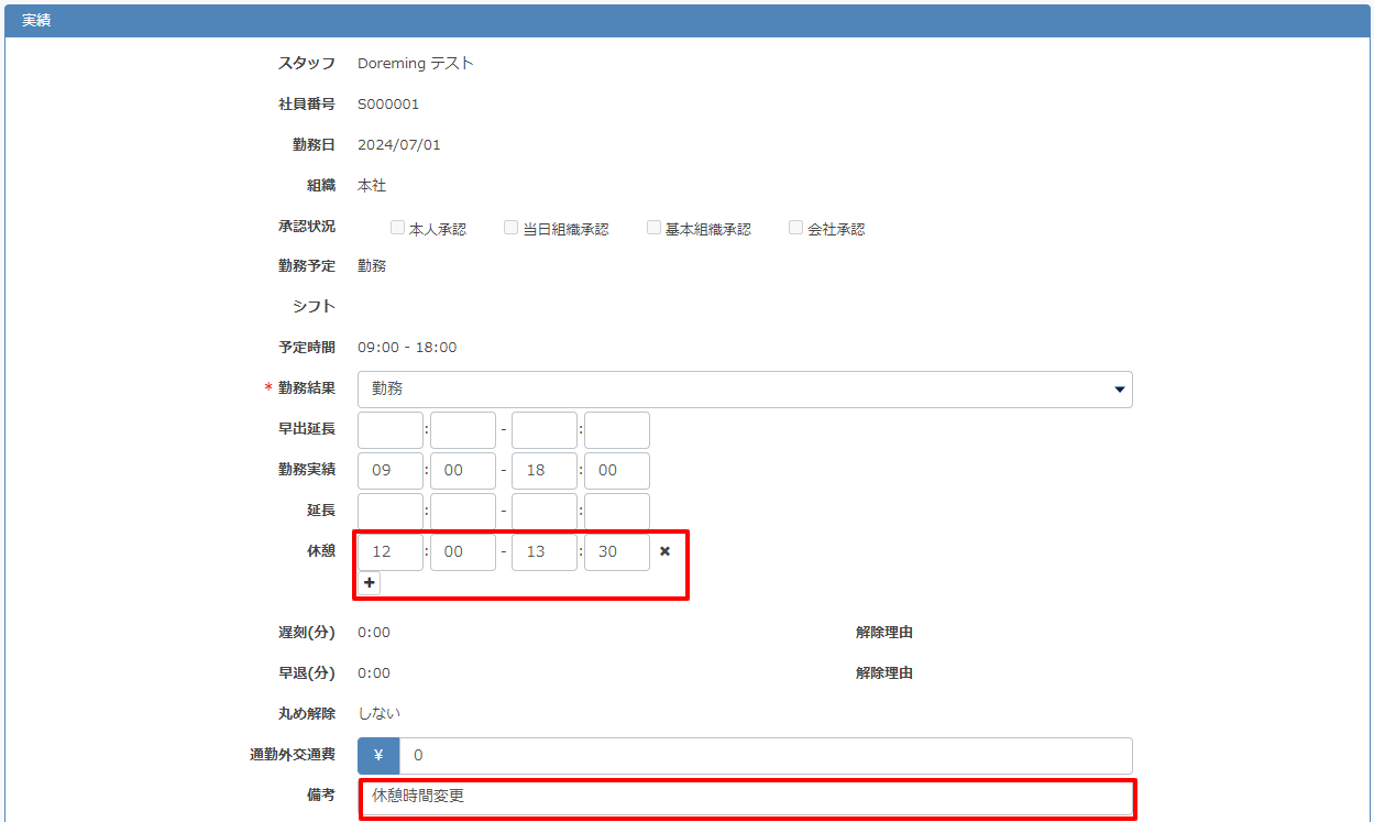 - 実績一覧に戻り、勤務時間、休憩時間、備考欄が更新されます。