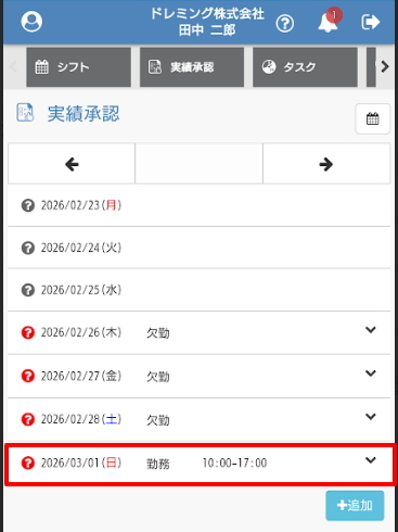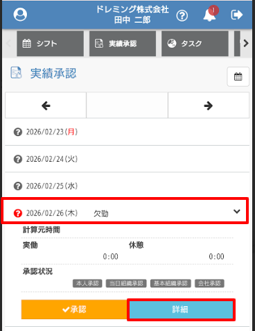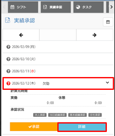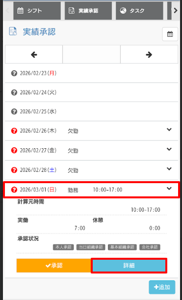 - 勤務実績を修正する場合は修正したい実績をタップし、詳細をタップします。