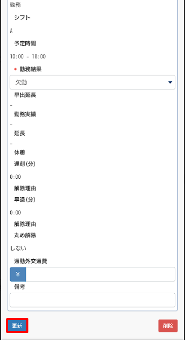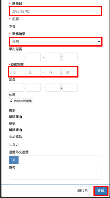 - 勤務結果:勤務結果を選択します。