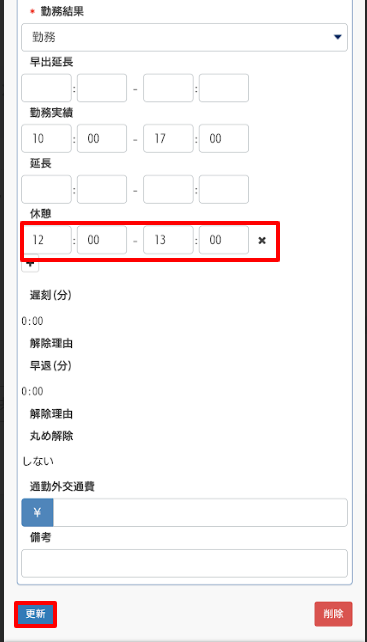 - 休憩時間を編集し、備考欄にも修正理由を入力し、下部の更新をクリックします。
