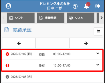 - 勤務実績が登録されます。
