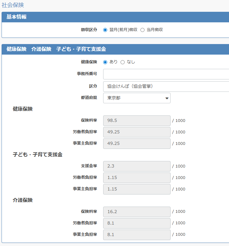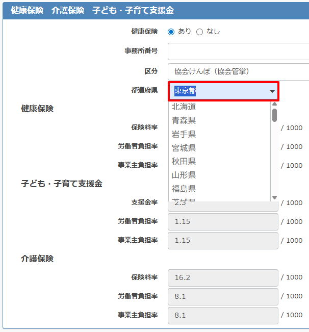※協会けんぽを選択された場合、事業所詳細情報で選択した都道府県の料率が自動で反映されます。