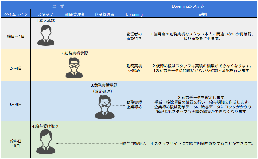 翌月5日〜9日までに前月分実績を承認する。給与項目の手当、控除の確認も行います。
