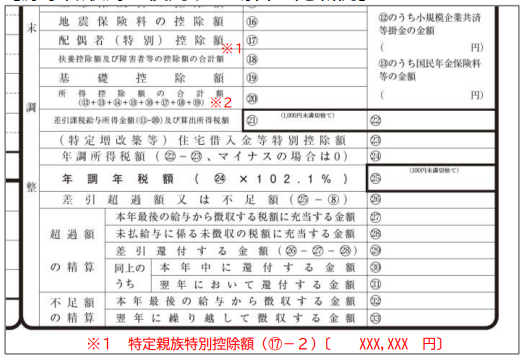 ※令和7年の源泉徴収簿には特定親族特別控除欄がないため、特定親族特別控除の滝用がある場合は欄外に以下のように記載いたします。