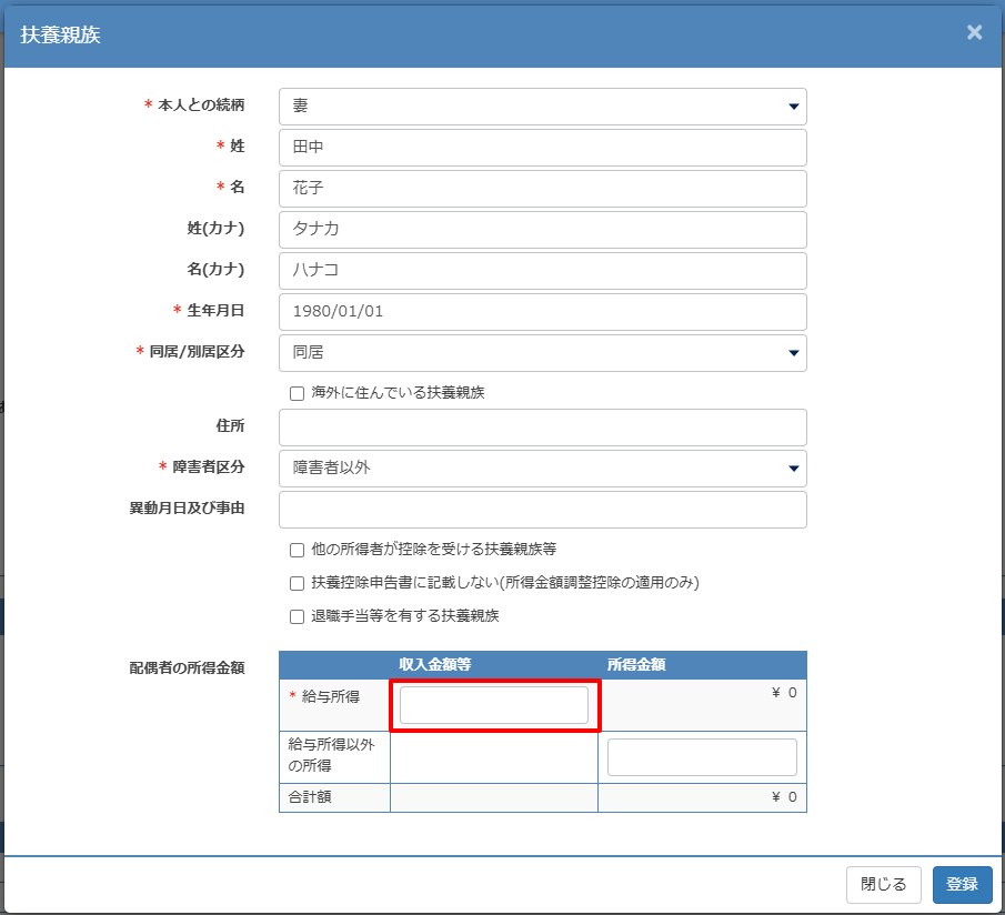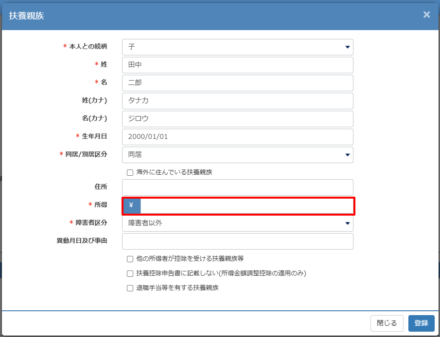Doremingに登録した配偶者、扶養親族の所得額で所得要件を満たしているかを判断します。