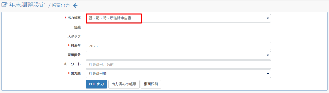 印刷する際の帳票名称は「基・配・特・所控除申告書」となります。