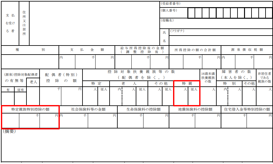 ※特定親族特別控除の創設に伴い、源泉徴収票、給与支払報告に特定親族特別控除人数、控除の額が追加されました。